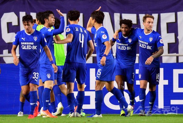 21일 경기도 수원월드컵경기장에서 열린 ‘하나원큐 K리그1 2019’ 수원 삼성과 성남 FC의 경기에서 수원 타가트(오른쪽)가 동점골을 성공한 뒤 동료들과 기쁨을 나누고 있다. 수원 | 김민성 기자 marineboy@donga.com