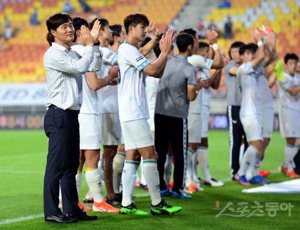 21일 경기도 수원월드컵경기장에서 열린 ‘하나원큐 K리그1 2019’ 수원 삼성과 성남 FC의 경기에서 성남이 수원에 2-1로 승리한 뒤 남기일 감독을 비롯한 선수들이 팬들에게 인사하고 있다. 수원 | 김민성 기자 marineboy@donga.com
