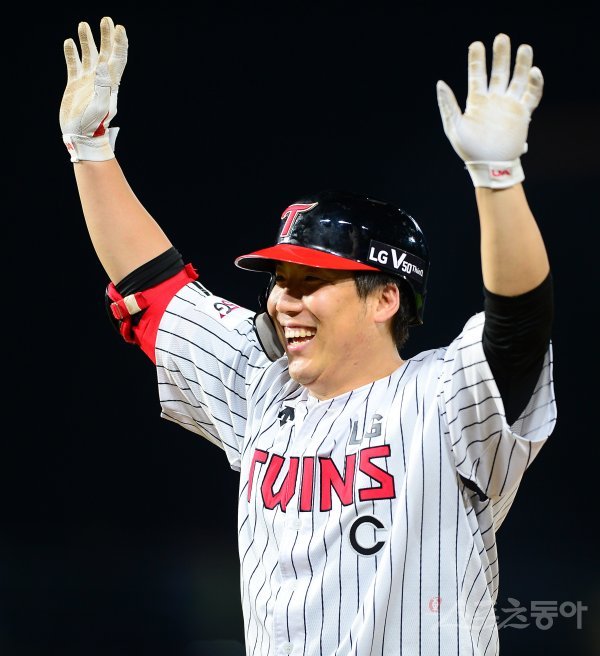 21일 창원NC파크에서 ‘2019 신한은행 MY CAR KBO리그’ 올스타전이 열렸다. 나눔올스타 LG 김현수가 7회말 역전 적시타를 친 후 덕아웃을 향해 안녕 세리머니를 하고 있다. 창원 | 김진환 기자 kwangshin00@donga.com