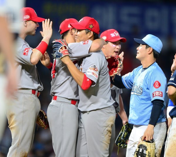 21일 창원NC파크에서 열린 ‘2019 신한은행 MY CAR KBO리그’ 올스타전에서 드림올스타가 9-7 역전승을 거뒀다. 경기 후 드림올스타 선수들이 기쁨을 나누고 있다. 창원 | 김진환 기자 kwangshin00@donga.com