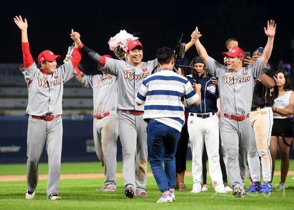 경기 후 MVP에 선정된 드림올스타 한동민이 김태훈, 하재훈(오른쪽)과 함께 미소를 지으며 입장하고 있다.