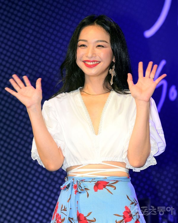 신유미가 카메라를 향해 포즈를 취하고 있다.