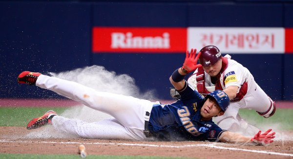 26일 서울 고척스카이돔에서 ‘2019 신한은행 MY CAR KBO리그’ NC 다이노스와 키움 히어로즈의 경기가 열렸다. NC 이명기가 4회초 무사 1,3루에서 후속 타자의 희생플라이 때 홈으로 쇄도, 세이프 되고 있다.