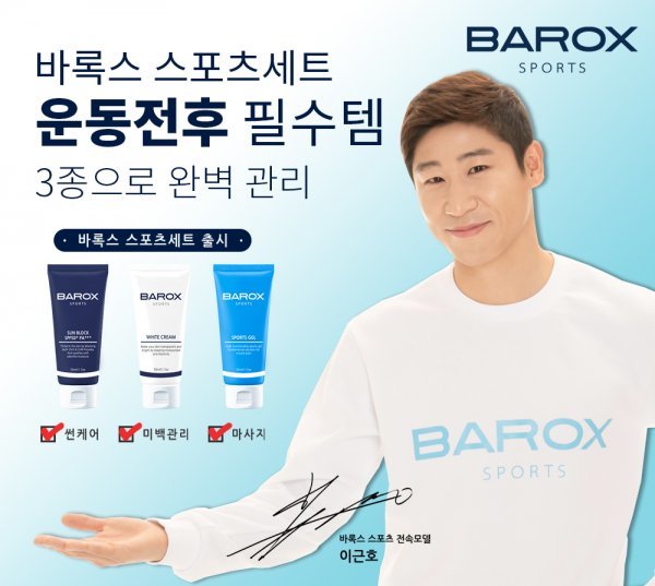 바록스스포츠 3종 세트는 운동 전 바록스 스포츠겔로 근육을 풀어준 뒤 자외선 차단제인 선크림을 발라 자외선을 차단하며 운동 후 다시 스포츠겔로 근육을 회복시키면서 동시에 화이트크림으로 피부의 미백과 주름개선 효능의 수분크림으로 피부를 보호하는 제품이다.