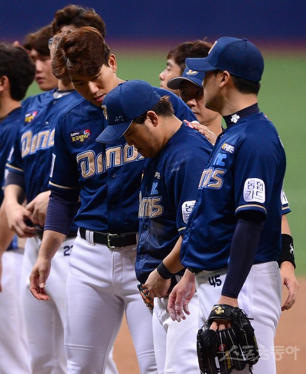 26일 서울 고척스카이돔에서 열린 ‘2019 신한은행 MY CAR KBO리그’ NC 다이노스와 키움 히어로즈의 경기에서 키움이 9회말 상대 송구 실책으로 끝내기 득점에 성공, 5-4 승리를 거뒀다. 경기 후 NC 모창민이 투수의 송구를 못 잡은 박석민을 위로하고 있다.