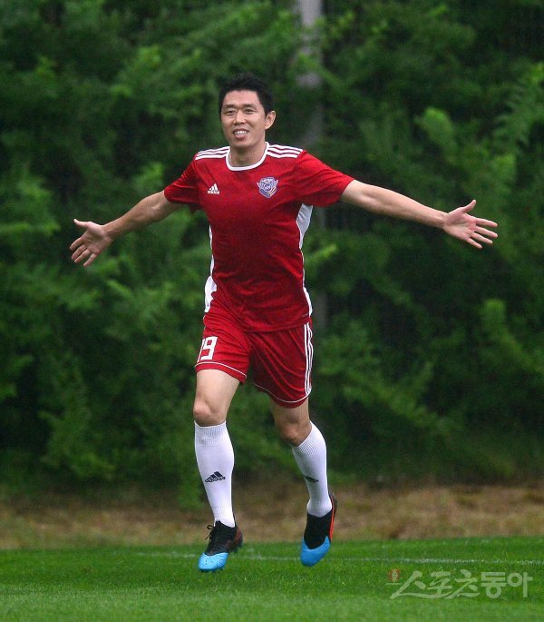 26일 서울월드컵경기장에서 펼쳐질 ‘팀 K리그 vs 유벤투스 FC Friendly Match 2019 in Seoul‘에 앞서 유벤투스 FC 레전드, 대한민국 축구 레전드, 연예계 스타들이 참가하는 ’나눔 매치’가 개최됐다. 이벤트 자선경기로 열린 ‘로얄FC’팀과 ‘더 레전드’팀 경기에서 ‘더 레전드’팀 현영민이 골을 넣은 후 환호하고 있다.
