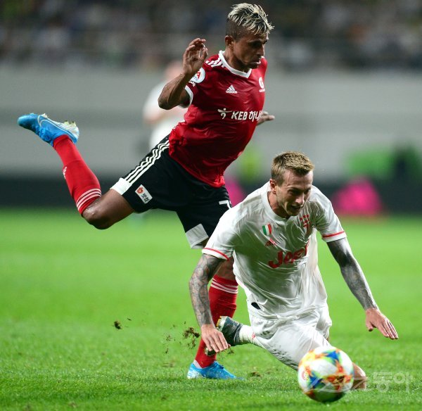 26일 서울월드컵경기장에서 열린 ‘팀 K리그 vs 유벤투스 FC Friendly Match 2019 in Seoul‘에서 유벤투스 베르나르데시와 팀 K리그 완델손이 볼다툼을 벌이고 있다.