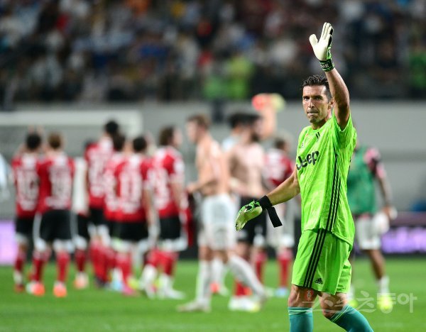 26일 서울월드컵경기장에서 열린 ‘팀 K리그 vs 유벤투스 FC Friendly Match 2019 in Seoul‘에서 경기를 마친 유벤투스 부폰이 팬들에게 인사하고 있다.