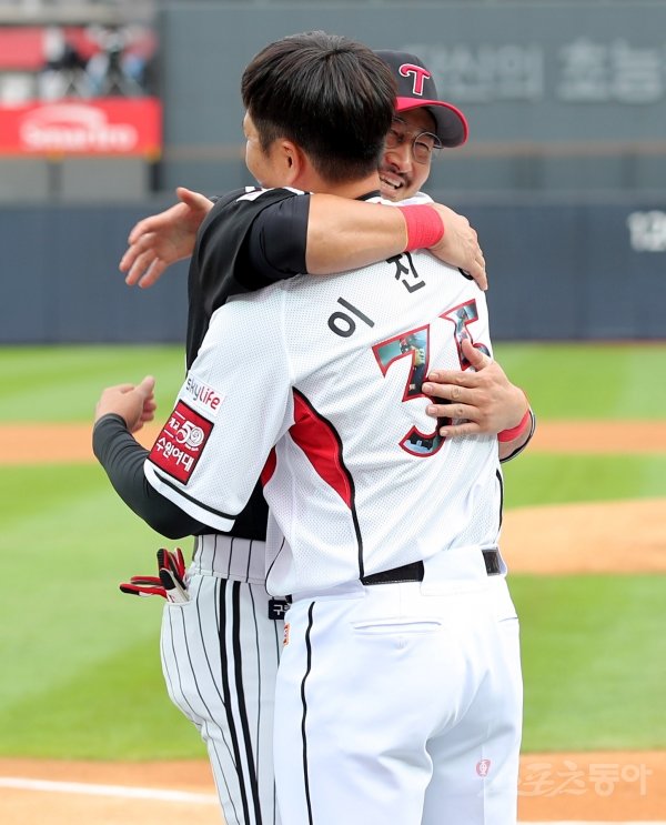 28일 경기도 수원 kt위즈파크에서 ‘2019 신한은행 MY CAR KBO리그’ LG 트윈스와 kt 위즈의 경기가 열린다. LG 박용택이 경기 전 열린 이진영의 은퇴식에서 이진영과 포옹을 하고 있다.