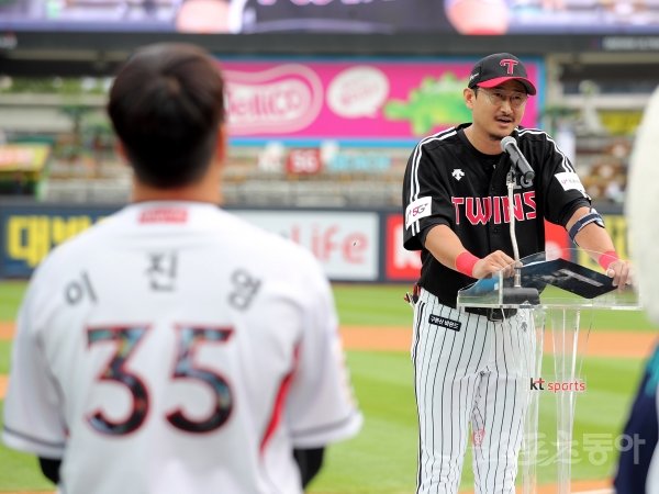 28일 경기도 수원 kt위즈파크에서 ‘2019 신한은행 MY CAR KBO리그’ LG 트윈스와 kt 위즈의 경기가 열린다. LG 박용택이 경기 전 열린 이진영의 은퇴식에서 은퇴사를 낭독하고 있다.