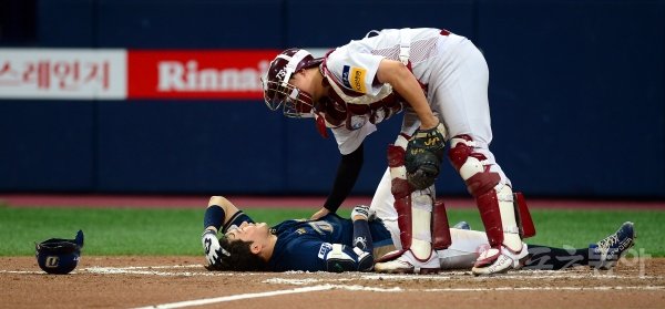 28일 서울 고척스카이돔에서 ‘2019 신한은행 MY CAR KBO리그’ NC 다이노스와 키움 히어로즈 경기가 열렸다. 3회초 무사 1루 NC 박민우가 몸쪽 볼을 피하다 그라운드에 넘어져 있다.