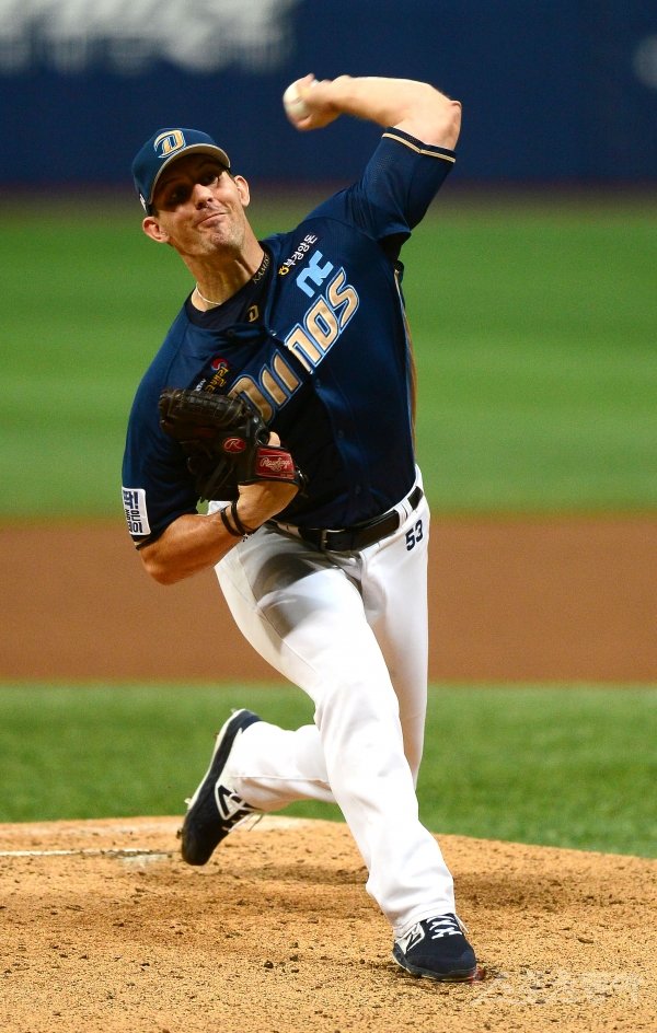28일 서울 고척스카이돔에서 ‘2019 신한은행 MY CAR KBO리그’ NC 다이노스와 키움 히어로즈 경기가 열렸다. 선발 투수로 등판한 NC 프리드릭이 역투하고 있다.