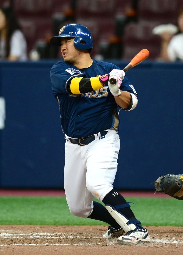28일 서울 고척스카이돔에서 ‘2019 신한은행 MY CAR KBO리그’ NC 다이노스와 키움 히어로즈 경기가 열렸다. 4회초 무사 2,3루 NC 박석민이 1타점 중전 안타를 치고 있다.