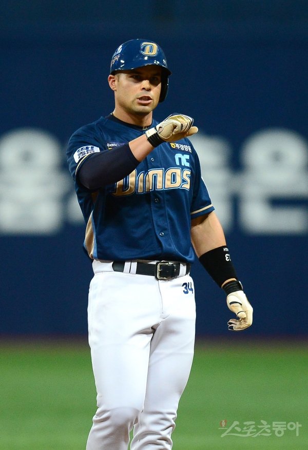 28일 서울 고척스카이돔에서 ‘2019 신한은행 MY CAR KBO리그’ NC 다이노스와 키움 히어로즈 경기가 열렸다. 4회초 무사 1,2루 NC 스몰린스키가 1타점 좌전 2루타를 치고 2루에서 기뻐하고 있다.