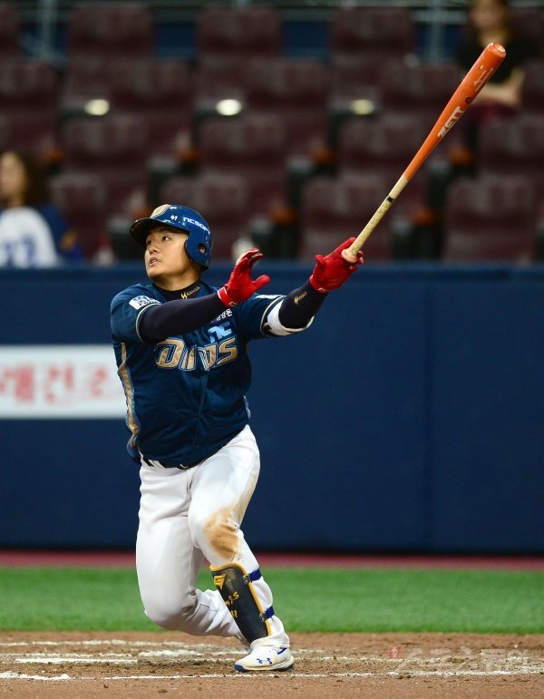 28일 서울 고척스카이돔에서 ‘2019 신한은행 MY CAR KBO리그’ NC 다이노스와 키움 히어로즈 경기가 열렸다. 3회초 2사 만루 NC 강진성이 좌월 만루 홈런을 날리고 있다.