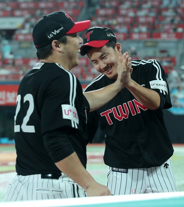 28일 경기도 수원 kt위즈파크에서 ‘2019 신한은행 MY CAR KBO리그’ LG 트윈스와 kt 위즈의 경기가 열렸다. LG 임찬규가 7회말 호수비를 보여준 김현수(왼쪽)와 하이파이브를 하고 있다.