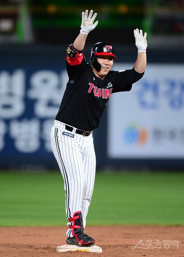 28일 경기도 수원 kt위즈파크에서 ‘2019 신한은행 MY CAR KBO리그’ LG 트윈스와 kt 위즈의 경기가 열렸다. LG 김현수가 9회초 1사 만루에서 2타점 2루타를 친 후 덕아웃을 향해 세리머니를 하고 있다.