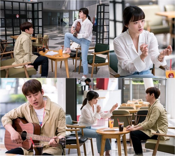 오늘(30일) 공개된 사진에 담긴 범상치 않은 두 남녀, 진주(천우희)와 범수(안재홍)의 범접할 수 없는 저세상 텐션이 보는 이의 시선을 사로잡는다. 방송국의 로비로 보이는 카페에서 뜬금없이 기타로 논쟁(?)을 벌이는 두 남녀. 테이블에 한쪽 발을 턱 올려놓은 채 심취해 연주 중인 진주와 어느새 그녀로부터 기타를 빼앗아 열창하고 있는 범수의 표정은 아이러니하게도 뚱딴지같은 이 상황과 달리, 세상 진지해 보여 절로 웃음을 유발한다. 이 조합, 역시 예사롭지 않다.