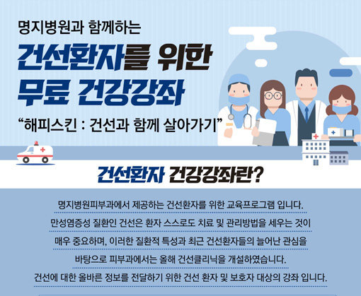 한양대학교 명지병원(병원장 김진구)는 8월 17일 오후 1시 병원 C관 4층 권역응급회의실에서 건선환자를 위한 무료 건강강좌를 개최한다.