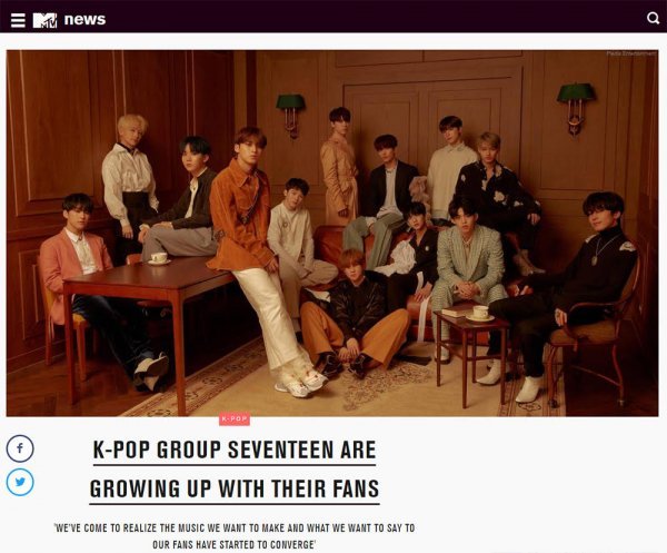 미국 음악 전문 채널 MTV는 30일(현지 시간) ‘K-POP GROUP SEVENTEEN ARE GROWING UP WITH THEIR FANS’라는 기사를 공개, 세븐틴은 물론 이들과 함께 성장해온 음악 그리고 팬들에 대한 이야기까지 진솔한 내용을 담은 인터뷰를 게재해 이목을 집중 시켰다.