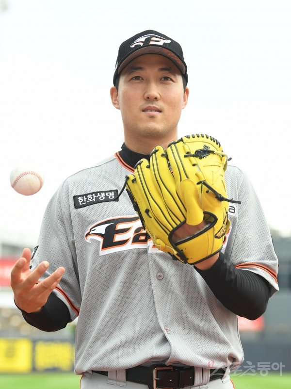 30일 수원KT위즈파크에서 ‘2019 신한은행 MY CAR KBO리그’ 한화 이글스와 KT위즈 경기가 열렸다. 한화로 트레이드 된 신정락이 취재진을 향해 포즈를 취하고 있다.