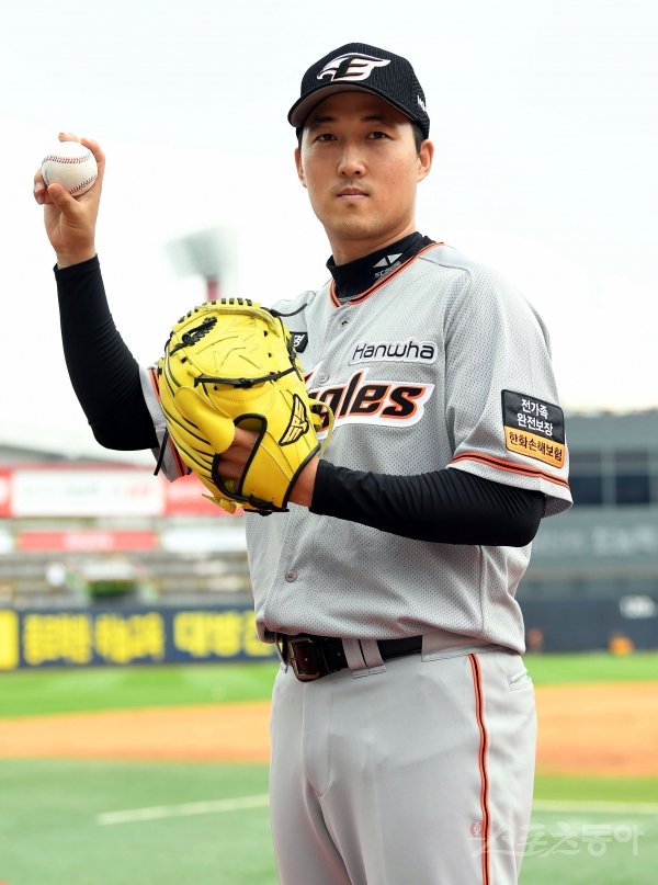 30일 수원KT위즈파크에서 ‘2019 신한은행 MY CAR KBO리그’ 한화 이글스와 KT위즈 경기가 열렸다. 한화로 트레이드 된 신정락이 취재진을 향해 포즈를 취하고 있다.