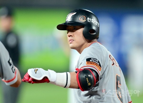 30일 수원KT위즈파크에서 ‘2019 신한은행 MY CAR KBO리그’ 한화 이글스와 KT위즈 경기가 열렸다. 5회초 2사 1,2루 한화 오선진이 동점 적시타를 치고 1루에서 주루코치와 주먹을 맞대고 있다.