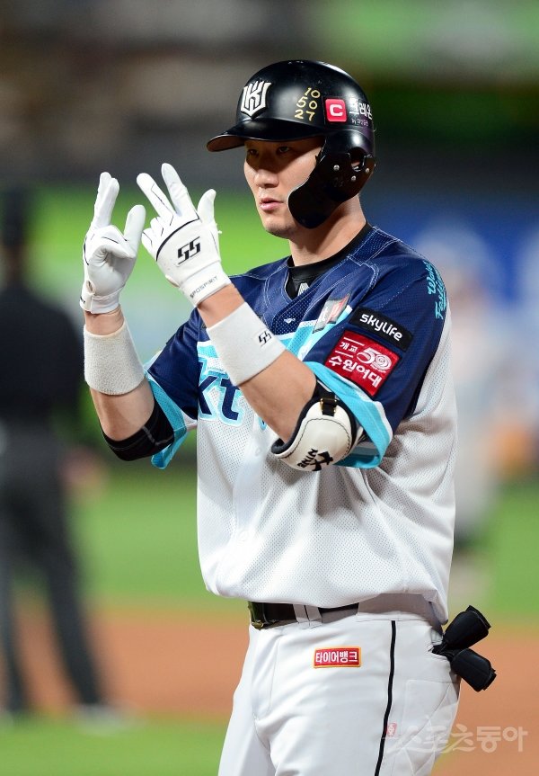 30일 수원KT위즈파크에서 ‘2019 신한은행 MY CAR KBO리그’ 한화 이글스와 KT위즈 경기가 열렸다. 5회말 무사 1,3루 KT 오태곤이 역전타를 치고 1루에서 세리머니를 하고 있다.