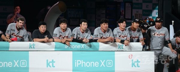 30일 수원KT위즈파크에서 ‘2019 신한은행 MY CAR KBO리그’ 한화 이글스와 KT위즈 경기가 열렸다. 2-3으로 패하며 8연패에 빠진 한화 선수들이 9회초 마지막 공격을 바라보고 있다.