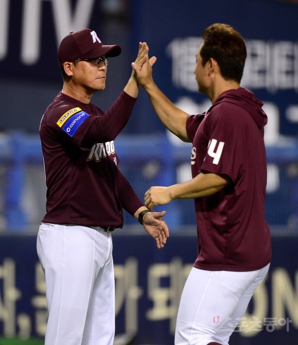30일 서울 잠실야구장에서 열린 ‘2019 신한은행 MY CAR KBO리그’ 키움 히어로즈와 LG 트윈스의 경기에서 키움이 4-2로 승리했다. 경기 후 키움 장정석 감독이 김상수(오른쪽)와 기쁨을 나누고 있다.