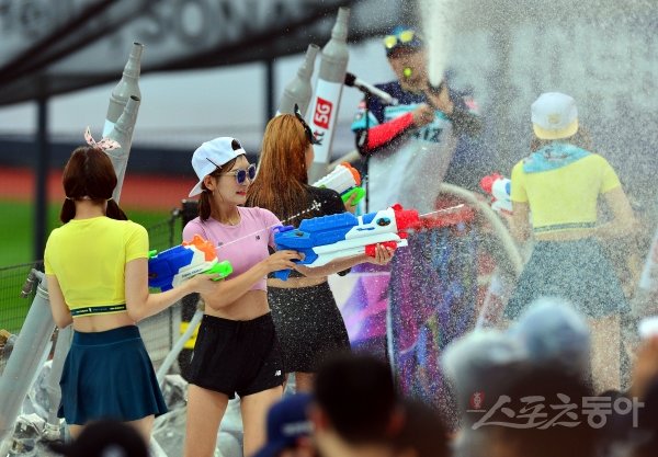 31일 경기도 수원 kt위즈파크에서에서 ‘2019 신한은행 MY CAR KBO리그’ kt 위즈와 한화 이글스의 경기가 열렸다. 워터 페스티벌을 맞아 kt 치어리더들이 팬들을 향해 물총을 쏘고 있다.