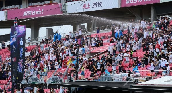 31일 경기도 수원 kt위즈파크에서에서 ‘2019 신한은행 MY CAR KBO리그’ kt 위즈와 한화 이글스의 경기가 열렸다. 워터페스티벌을 맞아 시원한 물대포가 관중들을 향해 발사되고 있다.