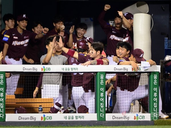 31일 서울 잠실야구장에서 ‘2019 신한은행 MY CAR KBO리그’ 키움 히어로즈와 LG 트윈스의 경기가 열렸다. 키움 덕아웃 선수들이 7회초 무사 만루에서 상대의 야수선택으로 2득점을 한 후 환호하고 있다.