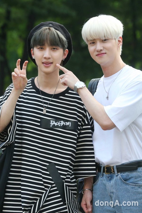 그룹 펜타곤의 후이(왼쪽)와 여원이 2일 오전 서울 영등포구 KBS신관 공개홀에서 열린 KBS2 \'뮤직뱅크\' 리허설에 참석해 포토타임을 갖고 있다.동아닷컴 국경원 기자 onecut@donga.com