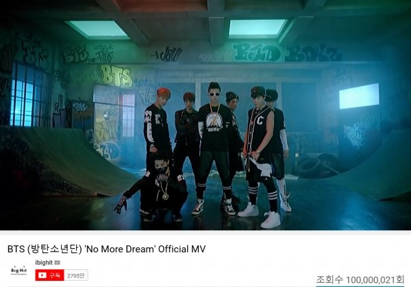 2013년 6월 발매된 방탄소년단의 데뷔 앨범 ‘2 COOL 4 SKOOL’의 타이틀곡 ‘No More Dream’은 3일 오후 6시 55분경 유튜브 조회수 1억 건을 넘었다.