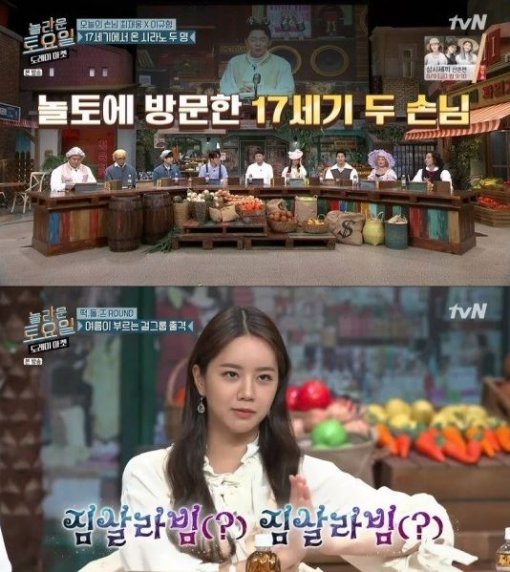 지난 3일 오후 방송된 tvN '놀라운 토요일-도레미마켓'에서는 레드벨벳 짐살라빔 가사 받아쓰기에 도전한 뮤지컬배우 이규형, 최재웅의 모습이 그려졌다.