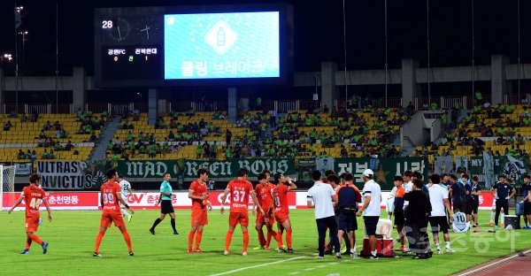4일 강원도 춘천 송암스포츠타운에서 열린 ‘하나원큐 K리그1 2019’ 강원FC와 전북 현대의 경기에서 무더위에 경기 중간 잠시 쿨링 브레이크 타임 때 양 팀 선수들이 물을 마시고 있다.
