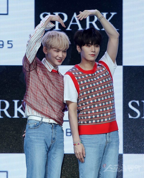 JBJ95의 켄타와 상균(오른쪽)이 서울 광진구 예스24 라이브홀에서 열린 새 미니앨범 ‘SPARK’ 발매 기념 쇼케이스에서 포토타임을 갖고 있다.