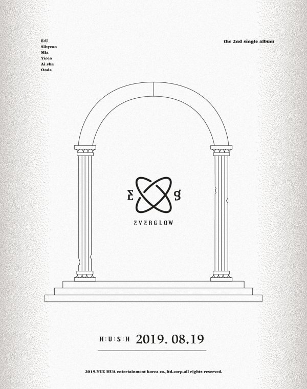 에버글로우의 두 번째 싱글 앨범명은 ‘HUSH’. ‘쉿’, ‘침묵’, ‘고요’의 사전적 의미인 ‘HUSH’와 몽환적이면서도 시크한 사진의 무드감으로 앨범 콘셉트에 대한 궁금증이 증폭되고 있다.