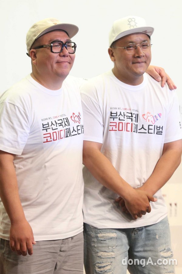 개그맨 조준우(왼쪽)와 조수원이 8일 오전 서울 마포구 스탠포드호텔에서 열린 제7회 <부산국제코미디페스티벌(BICF)> 기자회견에서 포토타임을 하고 있다.