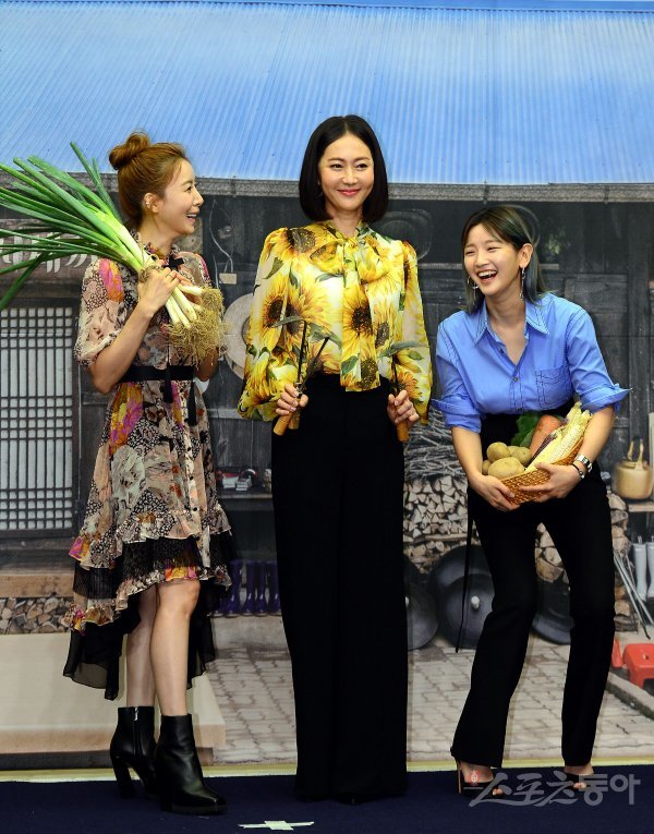 8일 서울 마포 스탠포드호텔에서 열린 tvN 예능 ‘삼시세끼 산촌편’ 제작발표회에 참석한 윤세아, 염정아, 박소담이 카메라를 향해 포즈를 취하고 있다.