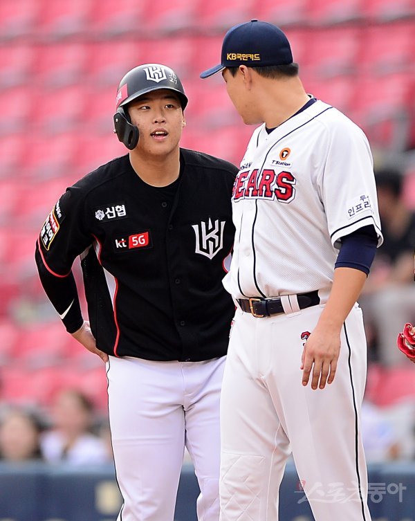 kt 강백호가 1회초 2사 안타를 친 후 두산 오재일(오른쪽)과 인사를 나누고 있다.