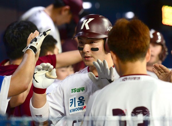 11일 서울 고척스카이돔에서 ‘2019 신한은행 MY CAR KBO리그’ 두산 베어스와 키움 히어로즈 경기가 열렸다. 7회말 1사 1루 키움 박병호가 중월 투럼 홈런을 날리고 그라운드를 돌아 홈인해 하이파이브 하고 있다.