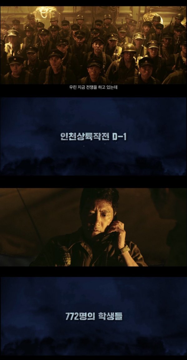 공개된 1차 예고편은 전투 경험이 없는 앳된 학생들의 모습과 “어쩌겠냐, 우린 지금 전쟁을 하고 있는 걸”이라는 대사를 통해 전쟁터에 내몰린 학도병의 이야기를 시작한다. 이들이 받은 명령은 장사로 가서 인천상륙작전을 성공시키기 위해 위장작전을 펼치는 것. 어두운 장사 해변 위, 빗발치는 총알 세례를 피해 상륙작전을 펼치는 학도병들의 처절한 모습과 숨 쉴 틈 없이 이어지는 전투 장면은 보는 이로 하여금 전쟁의 한복판에 있는 듯한 생생한 느낌을 전달한다. 여기에 ‘아무도 성공을 말하지 못했지만, 그 누구도 포기하지 않았다’는 카피가 더해져 772명 학도병들의 가슴 뜨거운 드라마에 관심을 집중시킨다. 아비규환의 상황에서도 결코 놓지 않은 두 손, 주인 없는 학생모들이 파도에 실려 넘실거리는 모습은 깊은 여운을 전한다.