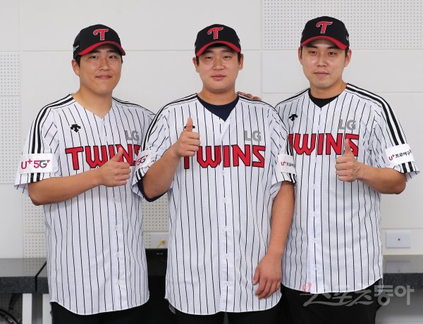 경기를 앞두고 12일 경찰청 야구단에서 전역을 한 LG 천원석과 박재욱, 최재원(왼쪽부터)이 포즈를 취하고 있다.