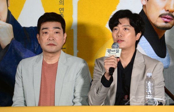 13일 서울 CGV 용산아이파크몰에서 열린 영화 ‘광대들: 풍문조작단’ 시사회에서 손현주와 박희순이 취재진의 질문에 대답하고 있다.