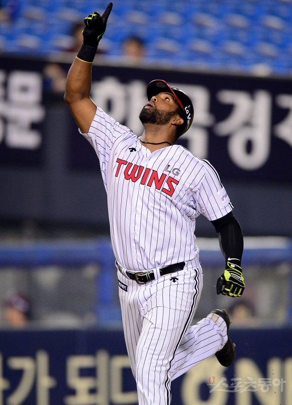 13일 서울 잠실야구장에서 ‘2019 신한은행 MY CAR KBO리그’ 키움 히어로즈와 LG 트윈스의 경기가 열렸다. LG 페게로가 5회말 2사 만루에서 만루홈런을 친 후 하늘을 향해 손가락을 가리키고 있다.