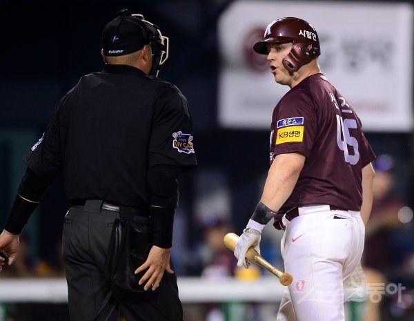 13일 서울 잠실야구장에서 ‘2019 신한은행 MY CAR KBO리그’ 키움 히어로즈와 LG 트윈스의 경기가 열렸다. 키움 샌즈가 7회초 1사 2루에서 삼진을 당한 후 구심을 바라보며 아쉬운 표정을 짓고 있다.