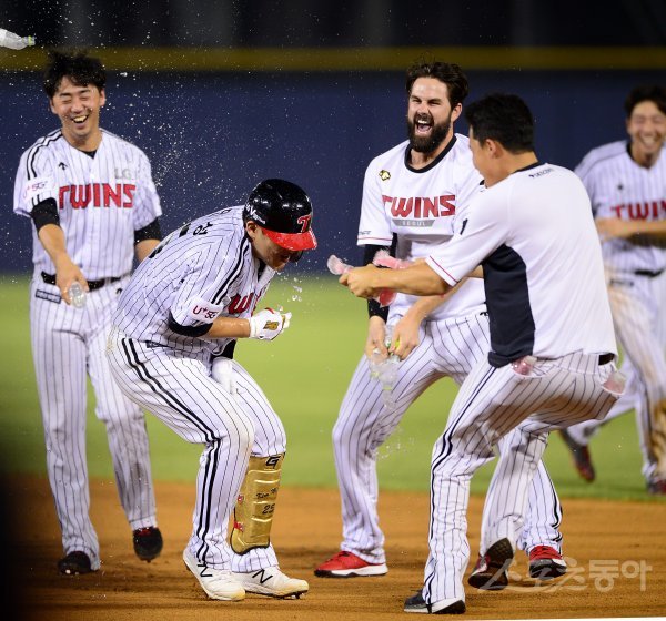 13일 서울 잠실야구장에서 열린 ‘2019 신한은행 MY CAR KBO리그’ 키움 히어로즈와 LG 트윈스의 경기에서 김민성의 9회말 끝내기 안타에 힘입어 LG가 8-7로 재역전승을 거뒀다. 경기 후 LG 김민성이 동료들에게 물세례를 받고 있다.