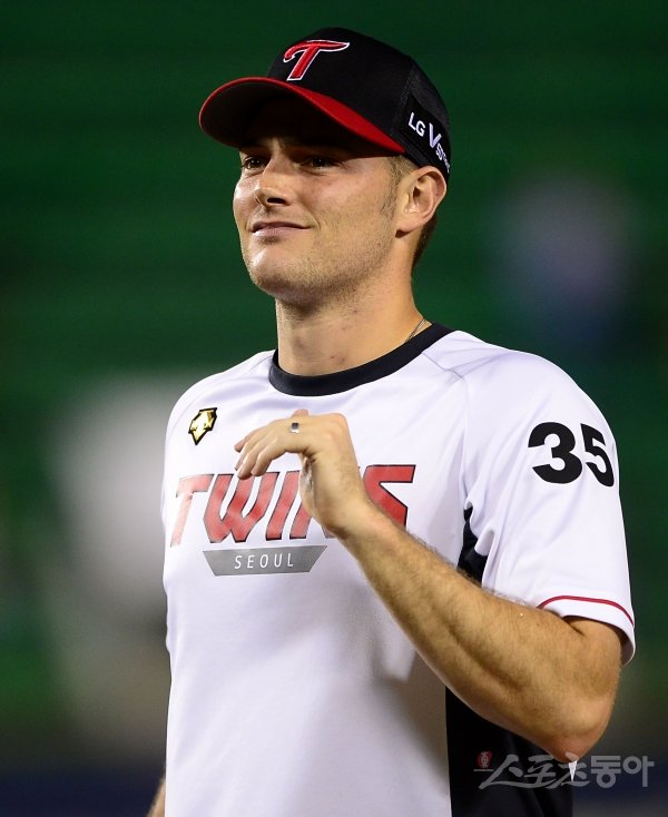 14일 서울 잠실야구장에서 열린 ‘2019 신한은행 MY CAR KBO리그’ 키움 히어로즈와 LG 트윈스의 경기에서 키움이 장단 17안타를 몰아치며 14-0 대승을 거두며 전날 끝내기 패배를 설욕했다. 경기 후 시즌 6패(10승)을 기록한 LG 윌슨이 관중석을 보며 미소를 짓고 있다.